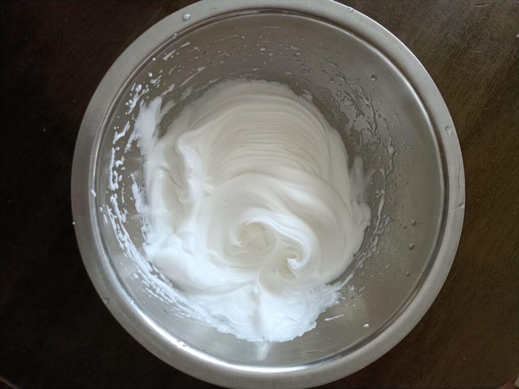 2 ◎卵白のボウルに◎砂糖小さじ1を加え、泡立ててメレンゲにします。(ハンドミキサーを使うのがおススメ!)ボウルを逆さにしてもこぼれないくらいの硬さまでにします。