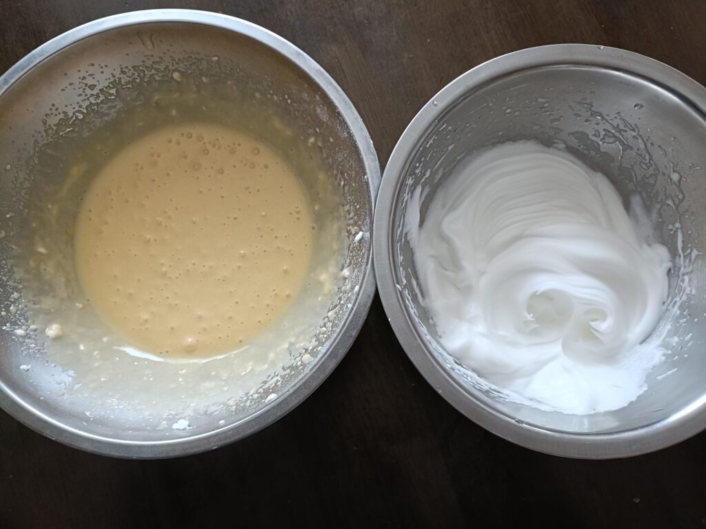 1 ◎卵白と卵黄を別々のボウルに入れます。