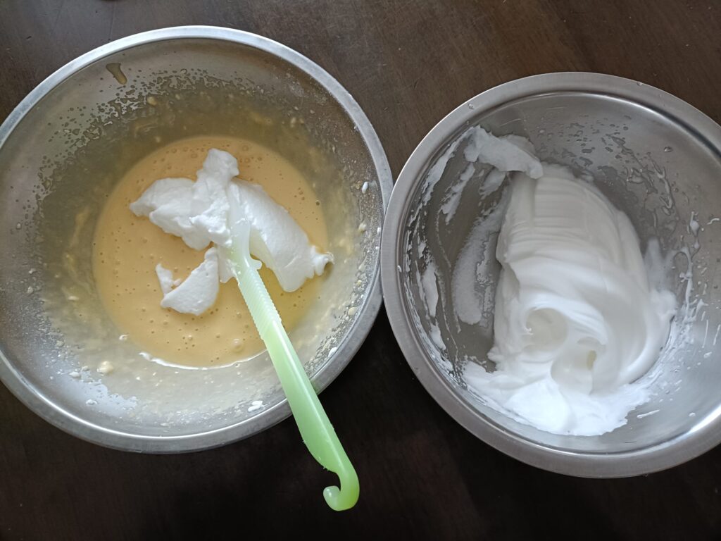 4 3が粉っぽくなくなったら、3にメレンゲを3回に分けて入れ、さっくりと混ぜます。