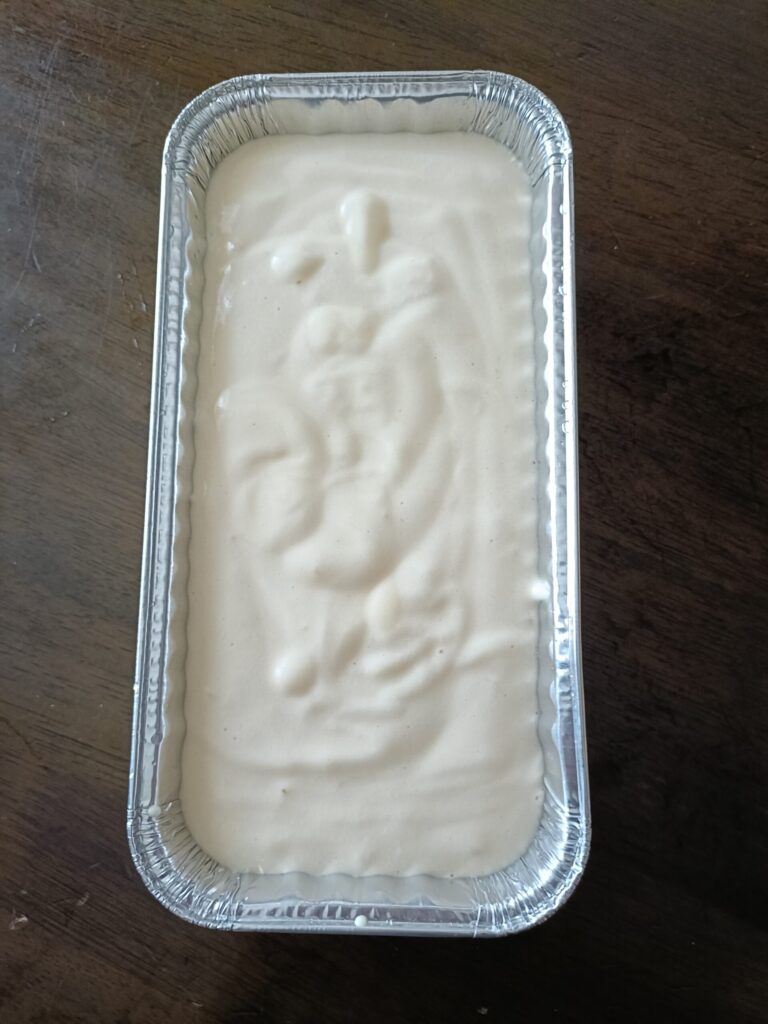 アルミでできた使い捨てのパウンド型です。サイズは小さいサイズから順にSS、S、M、Lの4種類あります。(写真はLサイズ!今回使うのもLサイズです!)